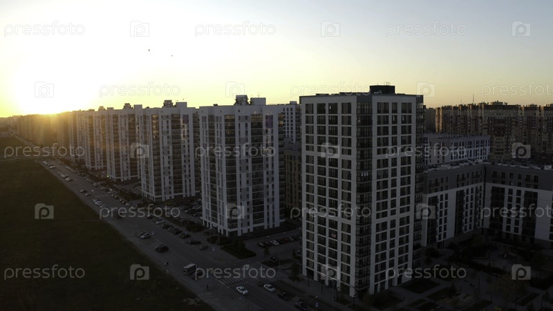 Закат над типичными панельными блоками многоквартирных домов. Резервные кадры. Вид с воздуха на красивый закат над спальной зоной города