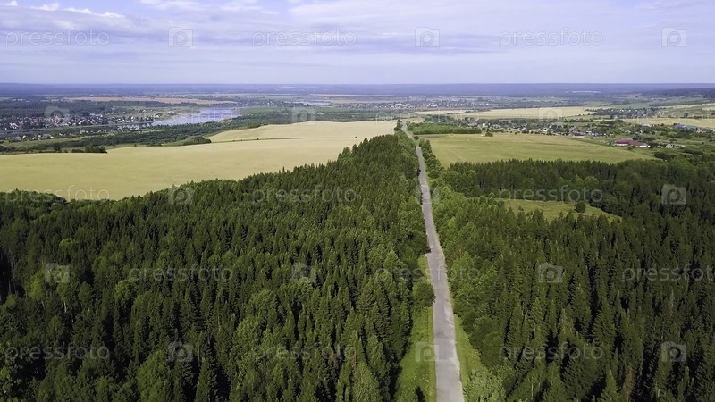 Летний зеленый лес, дорога, небольшой кусок города виден сзади, голубое небо, река и маленькие поля