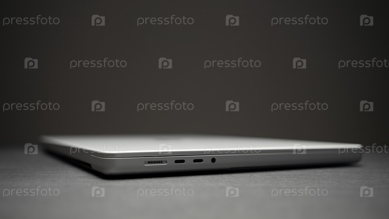 Боковой вид нового современного белого ноутбука, лежащего на поверхности стола у стены