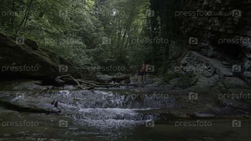 Отец и дочь в тропиках.Креативность.Семья, гуляющая по лесу с кристально чистым озером рядом и зеленой растительностью вокруг.Высококачественные кадры 4k