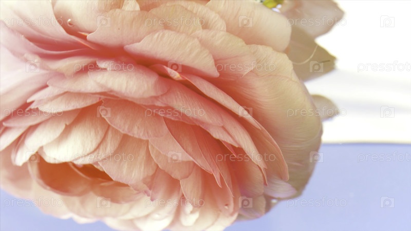 Макро-красивая роза помещена вверх дном под водой на светло-голубом фоне. резервные кадры. Цветение мягкого цветка покрывает вид