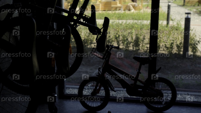 Парковка велосипедов внутри здания с панорамными окнами. резервная запись. паркованные велосипеды для детей и взрослых в помещении