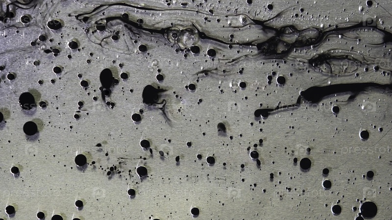 Вид сверху черных капель чернил, текущих в жидком масле на металлическом сером фоне.Черные шарики краски плавают на поверхности жирного вещества