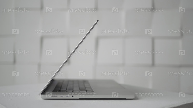 Боковой вид нового ноутбука на белом фоне. Продолжайте. Красивый ноутбук на столе. Ноутбук открывается под углом для рекламного вставки