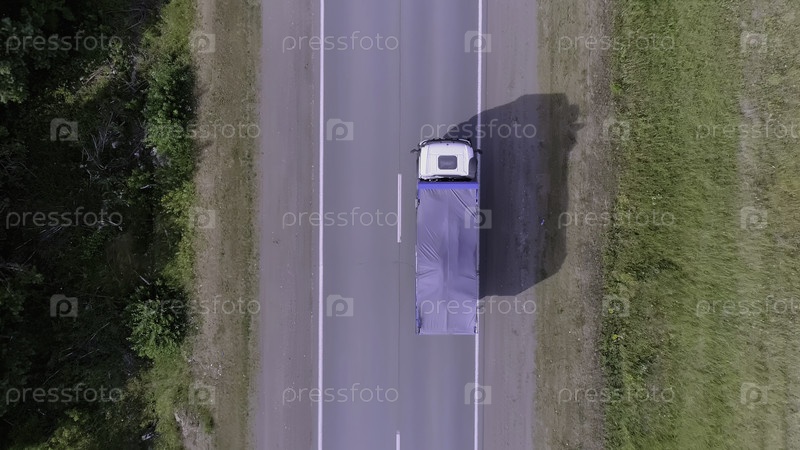 Вид сверху на грузовик, движущийся по дороге.Сцена.Концепция транспорта, грузовик, двигающийся по шоссе