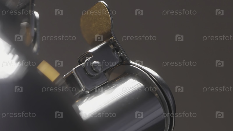 Закройте вращающийся закрытый короткий реактивный металлический серебряный чайник на размытом сером фоне стены