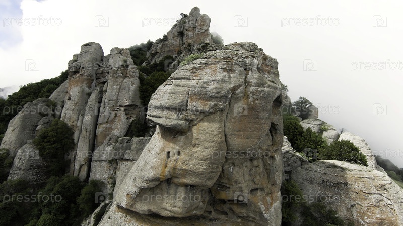 Вид с воздуха на необычные скальные образования и зеленую траву.Вперед, туман и облака и горные вершины, красота природы