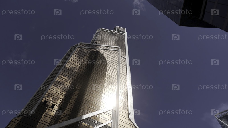 Нижний вид нового бизнес-центра, современного района в большом городе на фоне синего неба