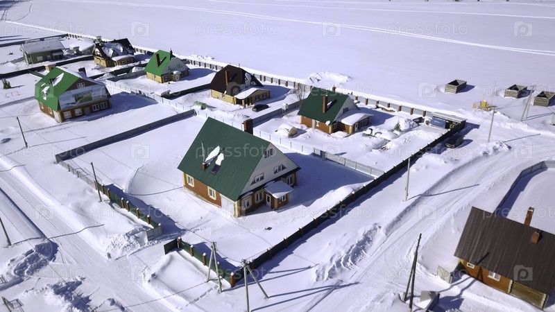 Вид на красивые коттеджи с белым снегом. Клип. Загородные коттеджи с прозрачным полем в зимний день. Котежная деревня в солнечный зимний день