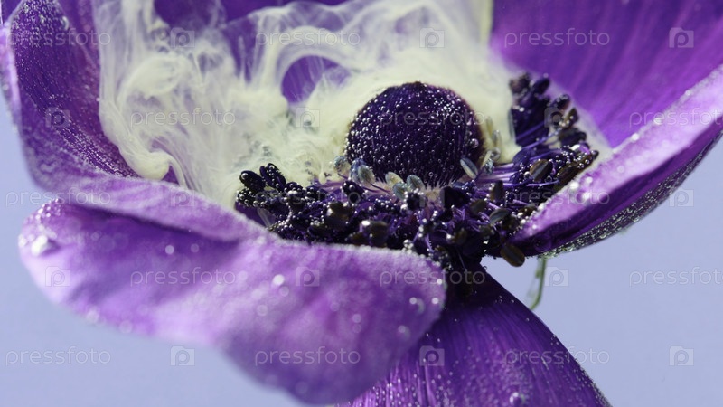 Закрытие хрупкого лиласа открыло бутоны цветов под водой и белый чернила распространяется по всему. резервные кадры. красивые лепестки небольшого цвета