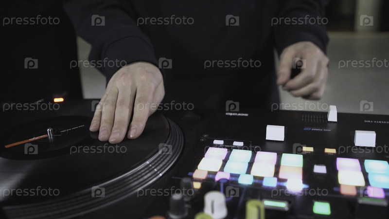 Запись диджея для дискотеки. Искусство. Покрытие руки диджея на миксере. Яркая музыкальная панель на вечеринке. Работа музыканта в ночном клубе