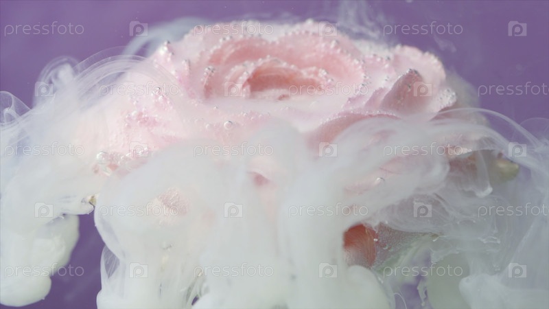 Макрообразный вид розового цветка, покрытого белой жидкой краской под водой. резервные кадры. мягкий цветок на розовом фоне
