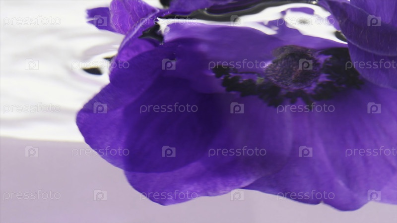 Закройте вид со стороны, чтобы погрузить фиолетовый цветочный бутон под водой. резервные кадры. мягкие лиловые лепестки в чистой воде