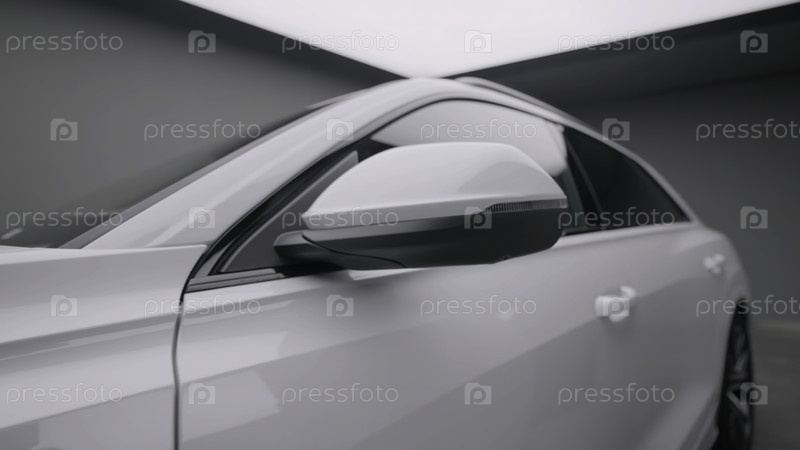 Современный автомобиль, вид на машину снаружи, боковые двери и зеркало, плавное движение камеры