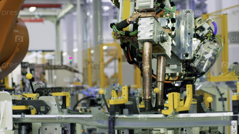Роботизированный механизм, промышленный робот в движении на современной фабрике Сцена Концепция тяжелой промышленности и машиностроения