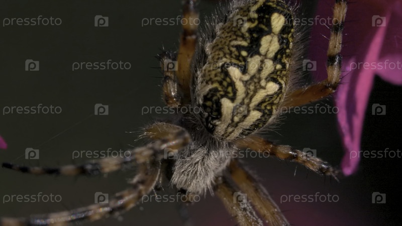Большой паук на цветах.Креативный.Большой, красивый паук с узором на спине сидит на цветках.Дикий паук на листьях цветов.Макрокосм летнего луга