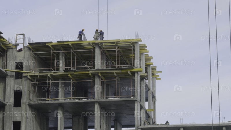 Строительная площадка работает против голубого неба.Рабочие на строительной площадке многоквартирного дома