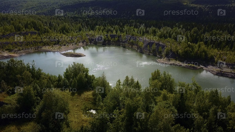 Вид с высоты птичьего полета. Клип. Красивый солнечный пейзаж со яркими лучами солнца, падающими на близко стоящие пихты и прозрачное голубое небольшое озеро. Высокое качество 4k кадры