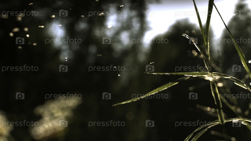 Пролетайте над зеленой травой.Пролетайте.Маленькие черные насекомые летают на зелёной траве под солнцем