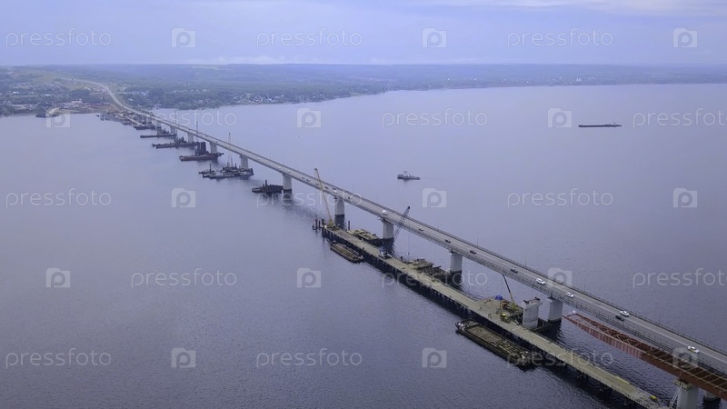 Огромный Крымский мост с автомобилями.Клип.Вид из беспилотника.Огромный мост с движением на море и огромным лесом вокруг