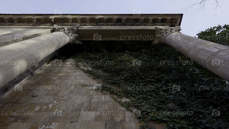 Впечатляющий фасад старого здания замка.Пойдем дальше.Нижний вид каменной стены храма с зеленым плюшем и колоннами, концепция архитектуры