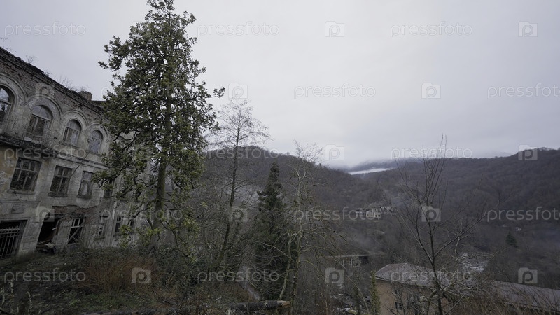 Серый пейзаж. продолжайте. серый весенний лес без листьев рядом со старым зданием и серое небо над головой. высококачественные кадры 4k