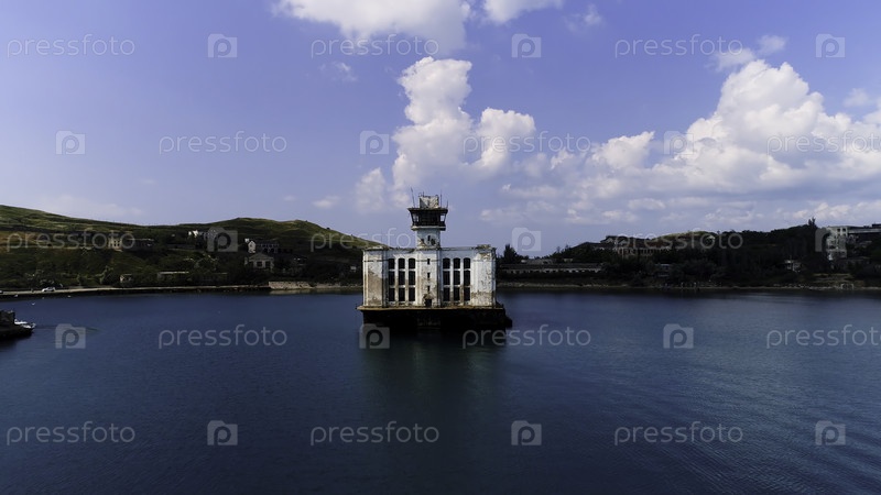 Яркое море с плавающими грузовыми кораблями.Снимок.Ярко-синие облака и море, большие горы с растительностью видны сзади