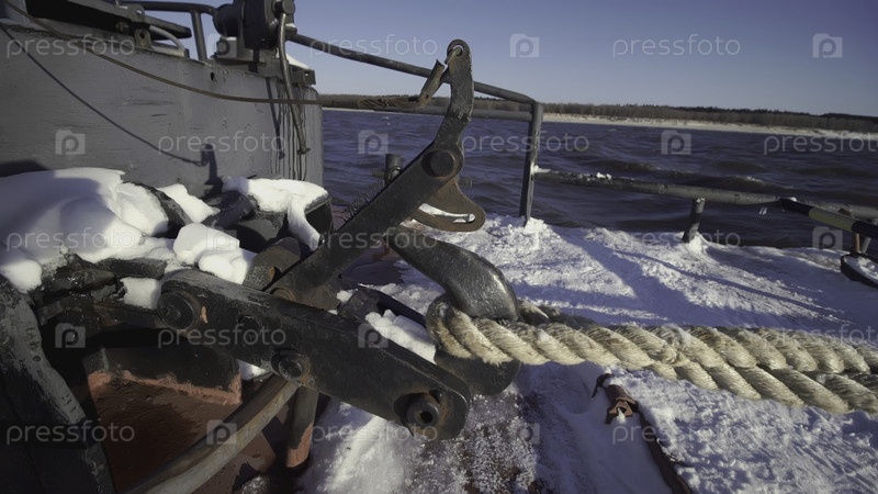 Большая баржа на Северном полюсе. Клип. На переднем плане - верёвка с айсиклами. На заднем фоне - тяжелая баржа в ледяной воде. Корабль, тянущий баржу в буксире