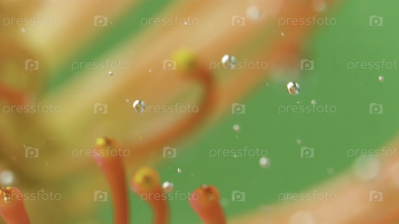 Закройте штаммы цветка под водой. Резервные кадры. Экзотические растения с яркими stamens. Красивое растение под водой с пузырями