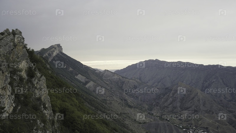 Вид на горную долину с небольшой деревней. Идите дальше. Красивый пейзаж горной долины в летний день. Горная долина с деревней в пасмурный день