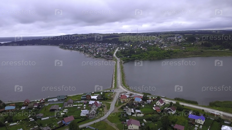 Летний вид с беспилотного летательного аппарата.Клип.Вид на небольшой город с рекой, мост над прудом с автомобилями, близлежащие парки, леса и дома и слегка облачное небо