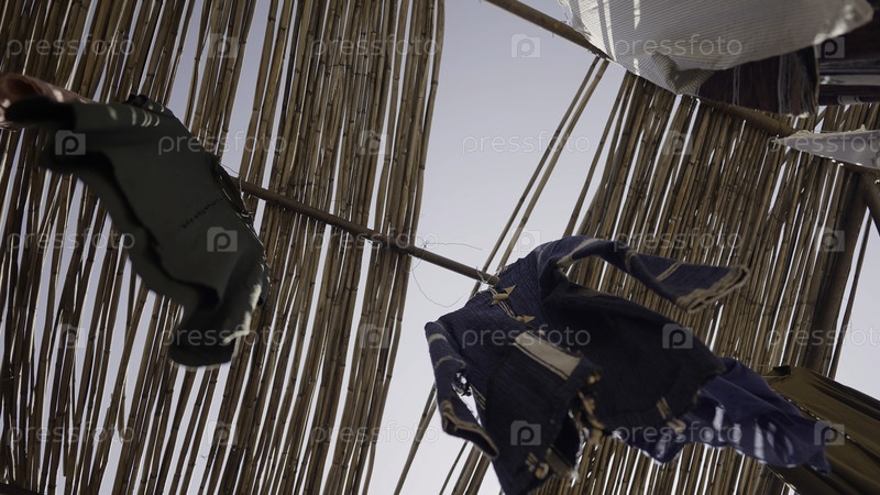 Нижний вид сушки одежды на открытом воздухе под ярким солнцем. продолжайте. висящая одежда и соломенная крыша с голубым небом над головой