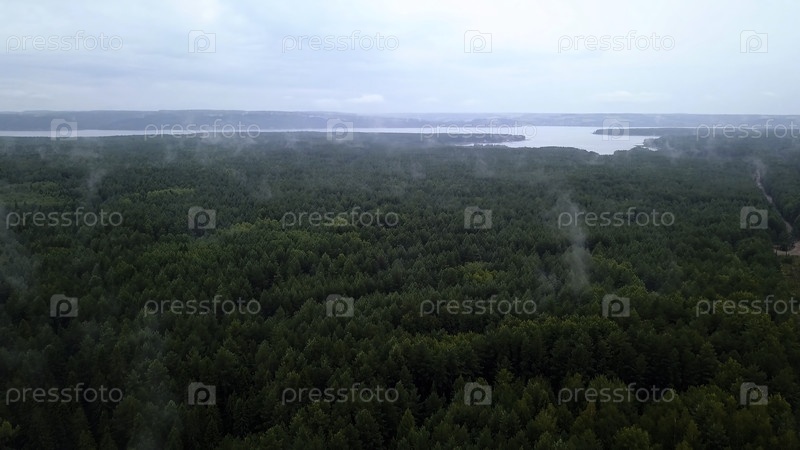 Светлый туман над зеленым лесом. Клип. Высокие деревья, стоящие близко друг к другу, и небольшое озеро с голубым небом видны