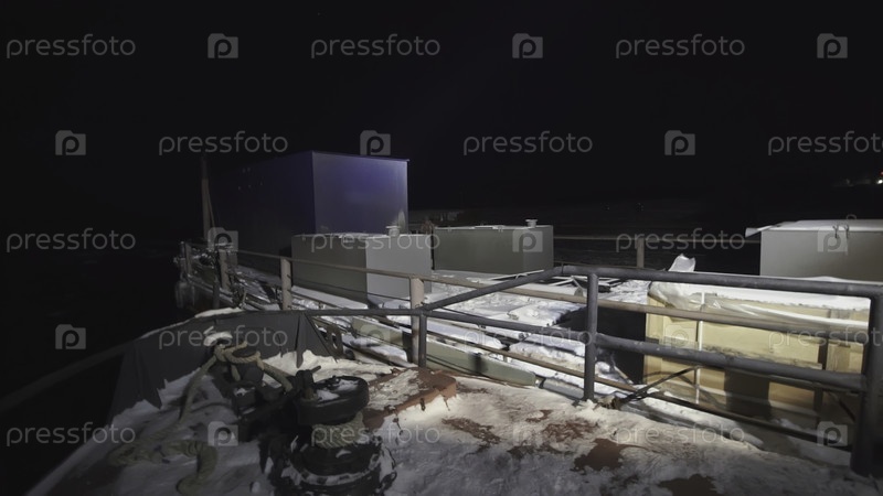 Вид с носа на пристань с грузом. Клип. Ночной вид с бока судна, якорь в зимней гавани на грузе, который находится в доке