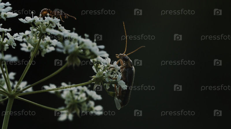 Цветок на макрографии.Креативно.Насекомые с большими усами сидят на маленьком белом цветке