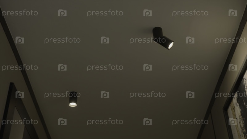 Нижний вид потолка с лампами внутри коридора квартиры. резервные кадры. интерьер квартиры со картинами на стенах