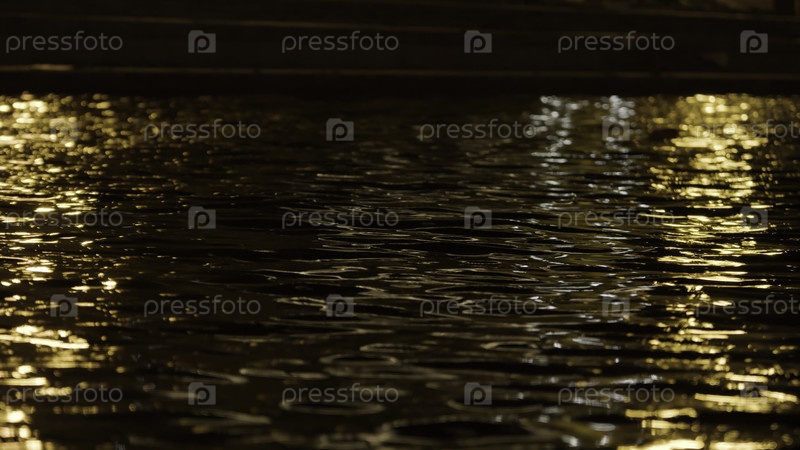Прекрасный ночной вид на городской пруд с волнами. резервные кадры. Закрытие движущейся поверхности воды отражением огней