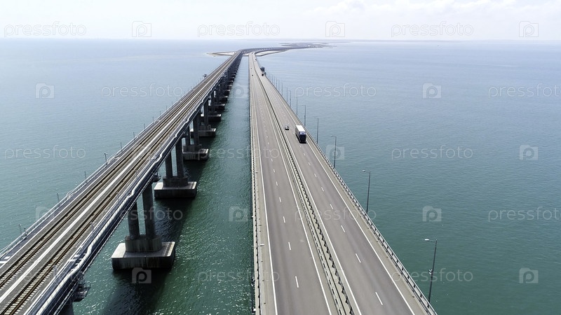 Вид с воздуха на мост через море с спокойной водой. идите вперед. длинный прямой мост с движущимися транспортными средствами над красивым морем