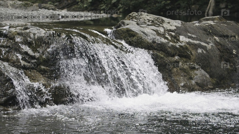 Красивая естественная река опускается в лес.Креативное.Речной поток превращается в водопад и продолжает течь.Каменный пейзаж реки образует водопад