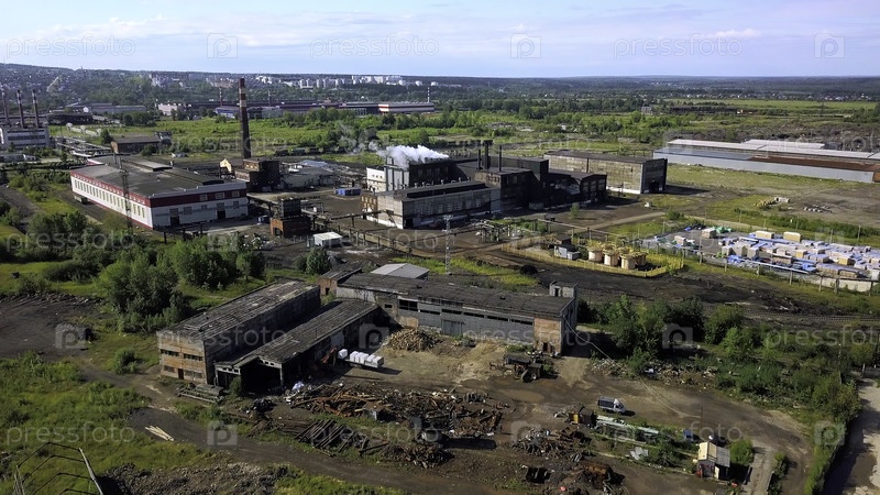 Городская индустрия беспилотных летательных аппаратов. Продолжайте. Вид с высоты на окраину с высокими дымоходами, откуда выходит дым