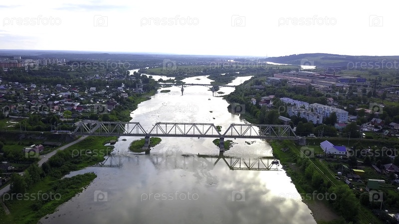 Прекрасный вид с вертолета. Клип. Вид на реку, над которой расположены мосты, дома располагаются рядом с рекой, зеленые горы и ярко белое небо видно