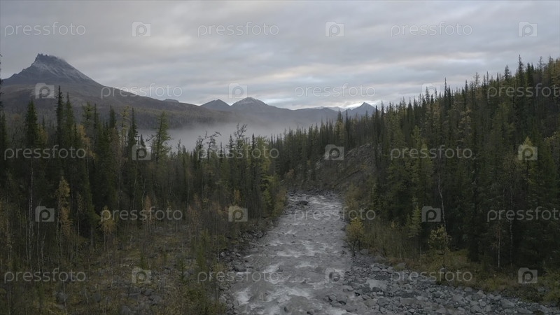 Вид на лесный пейзаж с рекой и горами с туманом. Красивый пасмурный день над лесной долиной с рекой и горами. Горная река в лесной зоне и туман