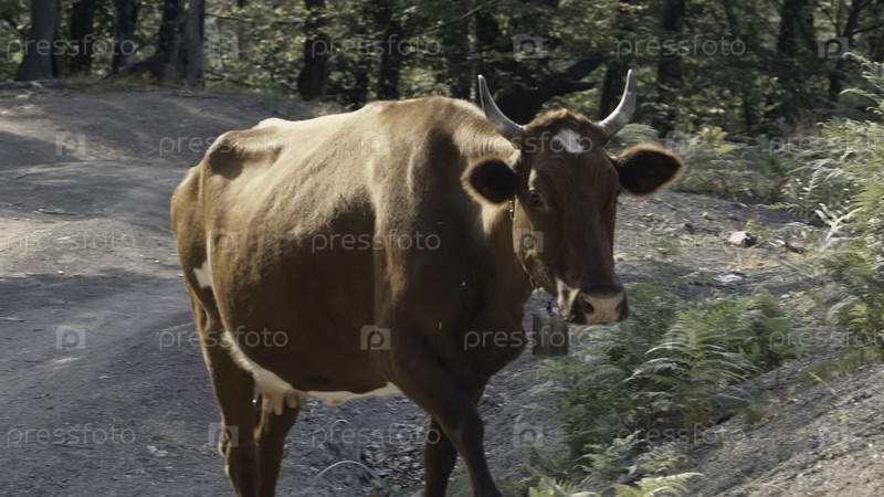 Большая красная корова, гуляющая вокруг в клещах - это концепция сельского хозяйства.Креативность.Корова в лесу в солнечный летний день