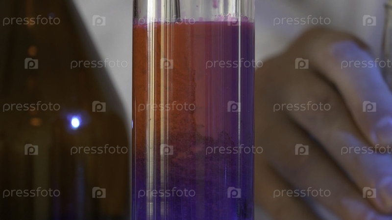 Ученый помещает химические вещества из синего образца в колбу.Здоровье и медицинская концепцияУченые занимаются экспериментальной наукой, такой как смешивание химических веществ