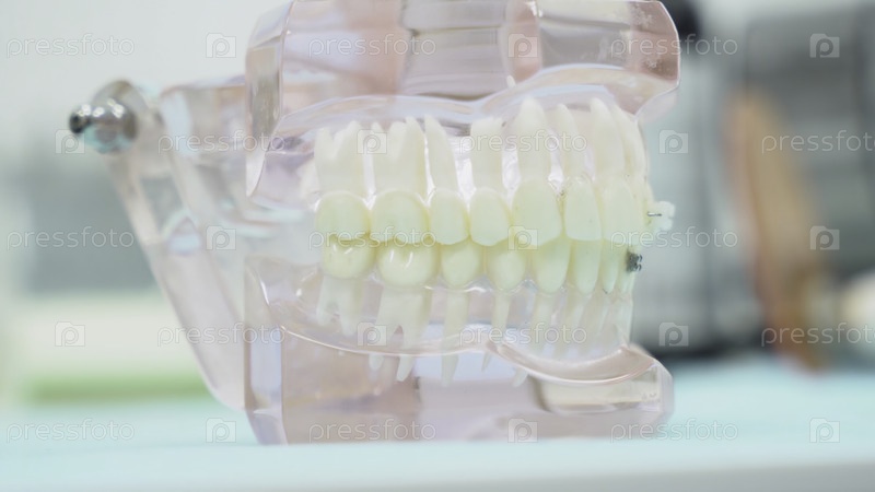 Закрытие челюсти. СМИ. Зубной протез с зубами и прозрачными деснами на столе в стоматологическом кабинете. Современный дизайн челюстного протеза