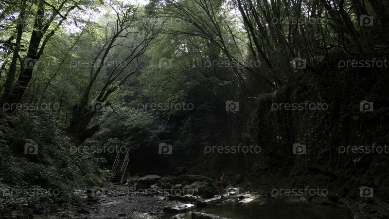 Отец и дочь в тропиках.Креативность.Семья, гуляющая по лесу с кристально чистым озером рядом и зеленой растительностью вокруг.Высококачественные кадры 4k