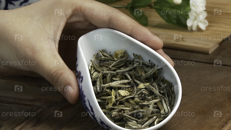 Стеклянный чайник с цветущим чаецветком внутри на деревянном фоне, китайский зеленый чай листья близко в традиционной чайной церемонии