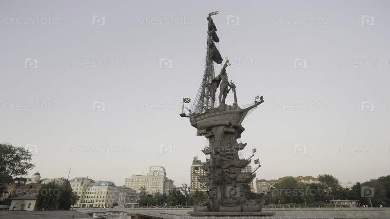 Памятник Петру Македонскому в Москве.Пойдем дальше.Красивый памятник с кораблем и капитаном в небе.Монумент Петру Великому на фоне городского пейзажа в солнечный летний день