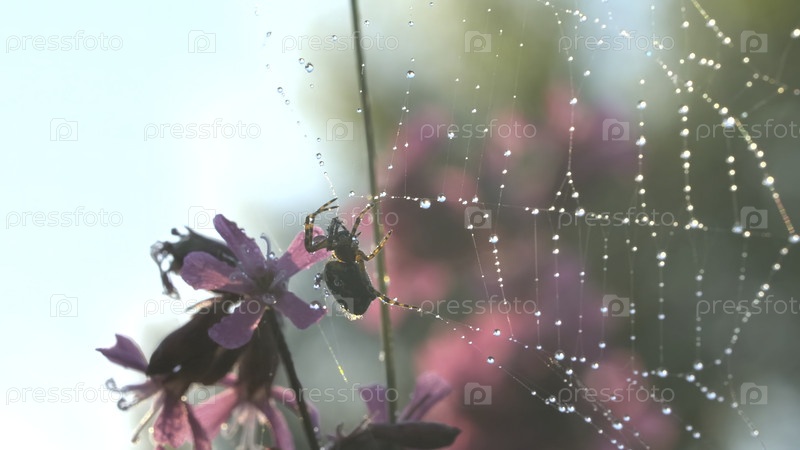 паук в сети с росой на летнем лугу. творческий. дикий паук в сети после дождя на летном луге. солнечный день в макромире луга