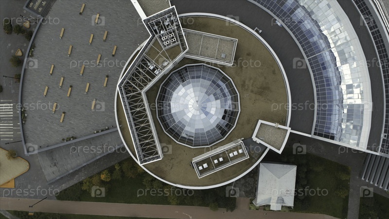Вид на крышу современного здания со стеклянным куполом. Резервные кадры. Прекрасное современное здание со стальным куполом на крыше. Стеклянный купол на крыше большого здания
